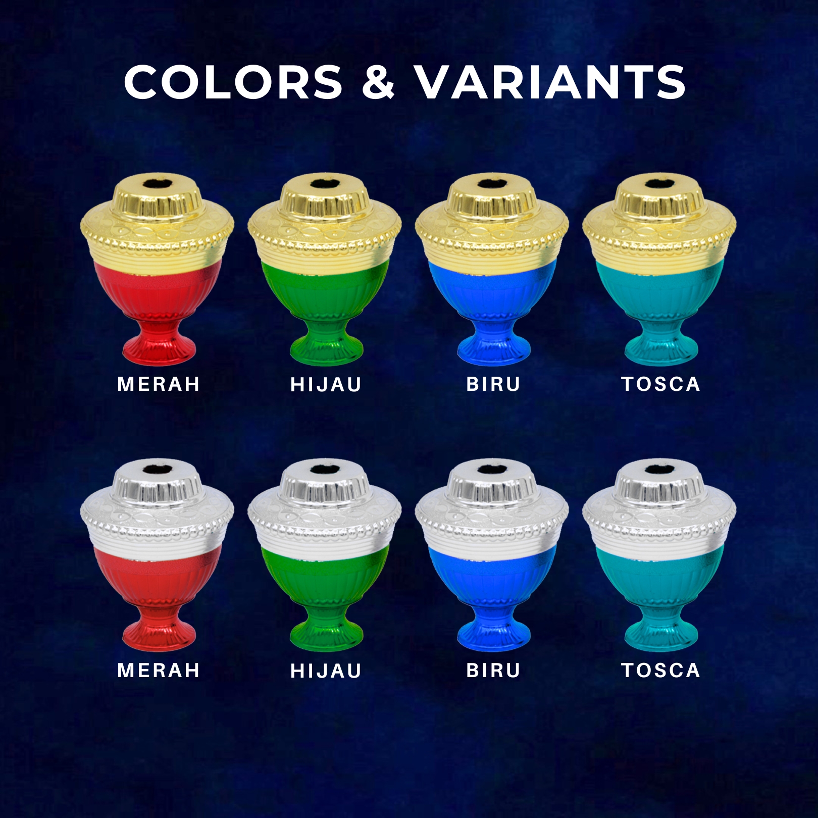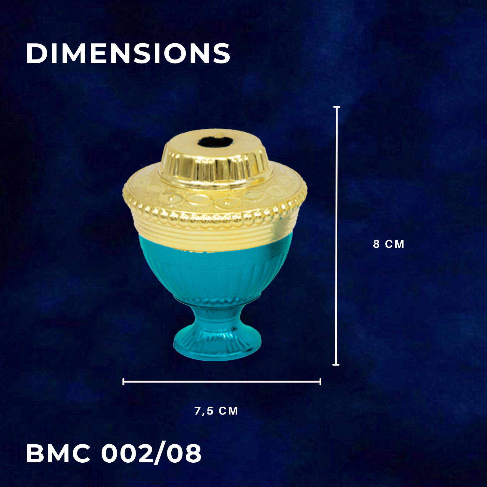 BMC 002/08 Tinggi : 8 cm Lebar : 7,5 cm tersedia dalam 2 warna dasar (gold dan silver) menawarkan 4 varian warna kombinasi : – merah – hijau – biru – tosca