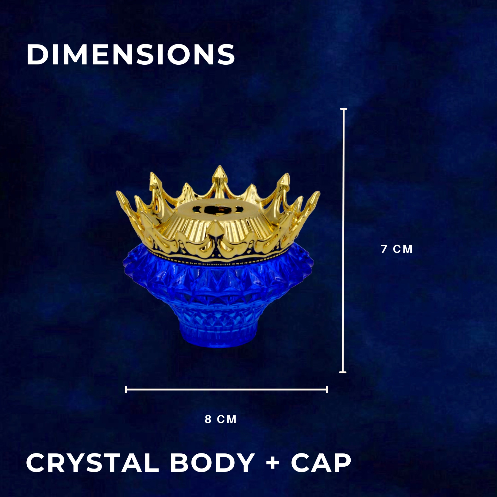 BADAN KRISTAL + TUTUP Tinggi : 7 cm Lebar : 8 cm tutup kristal tersedia dalam 2 warna dasar (gold dan silver) menawarkan 5 varian warna kristal : – merah – hijau – biru – tosca – transparan