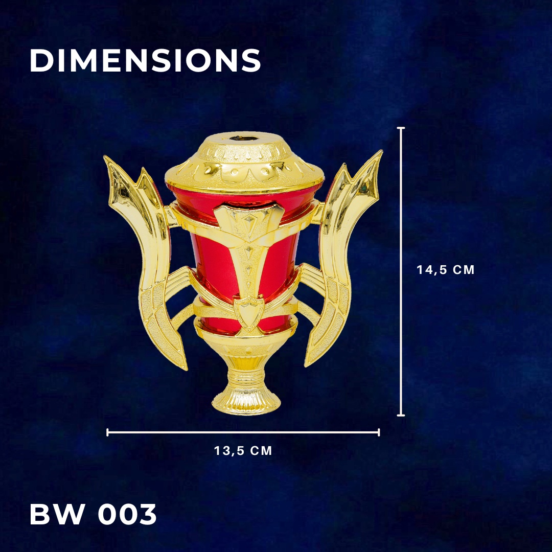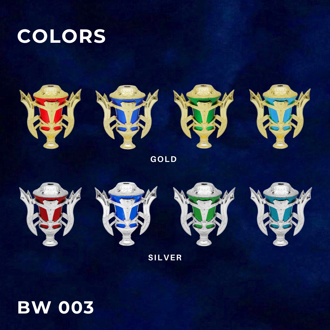 BADAN WING Tinggi : 14,5 cm Lebar : 13,5 cm tersedia dalam 2 warna dasar (gold dan silver) menawarkan 4 varian warna kombinasi : – merah – biru – hijau – tosca