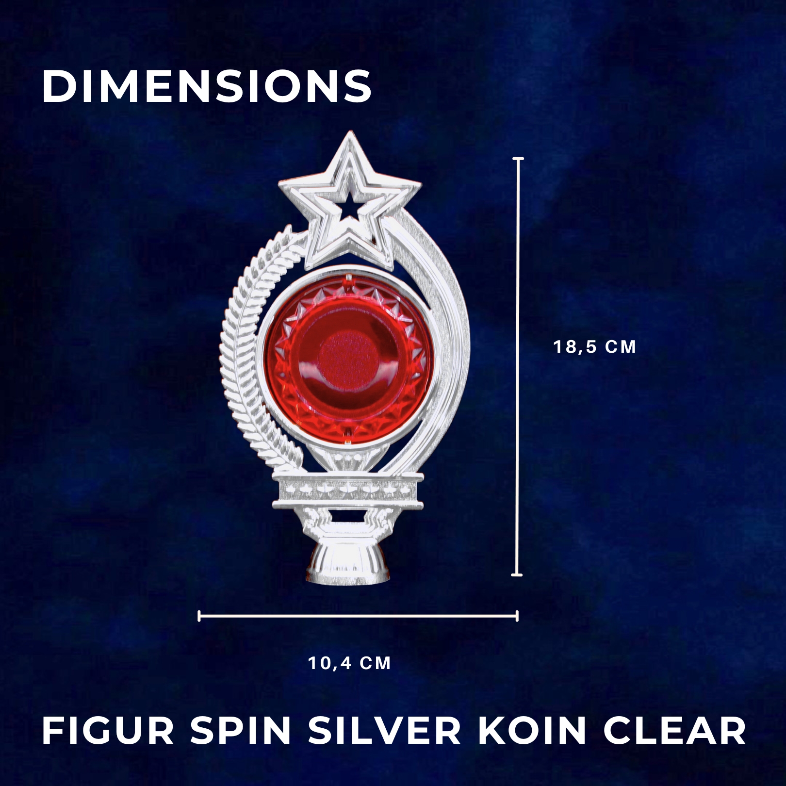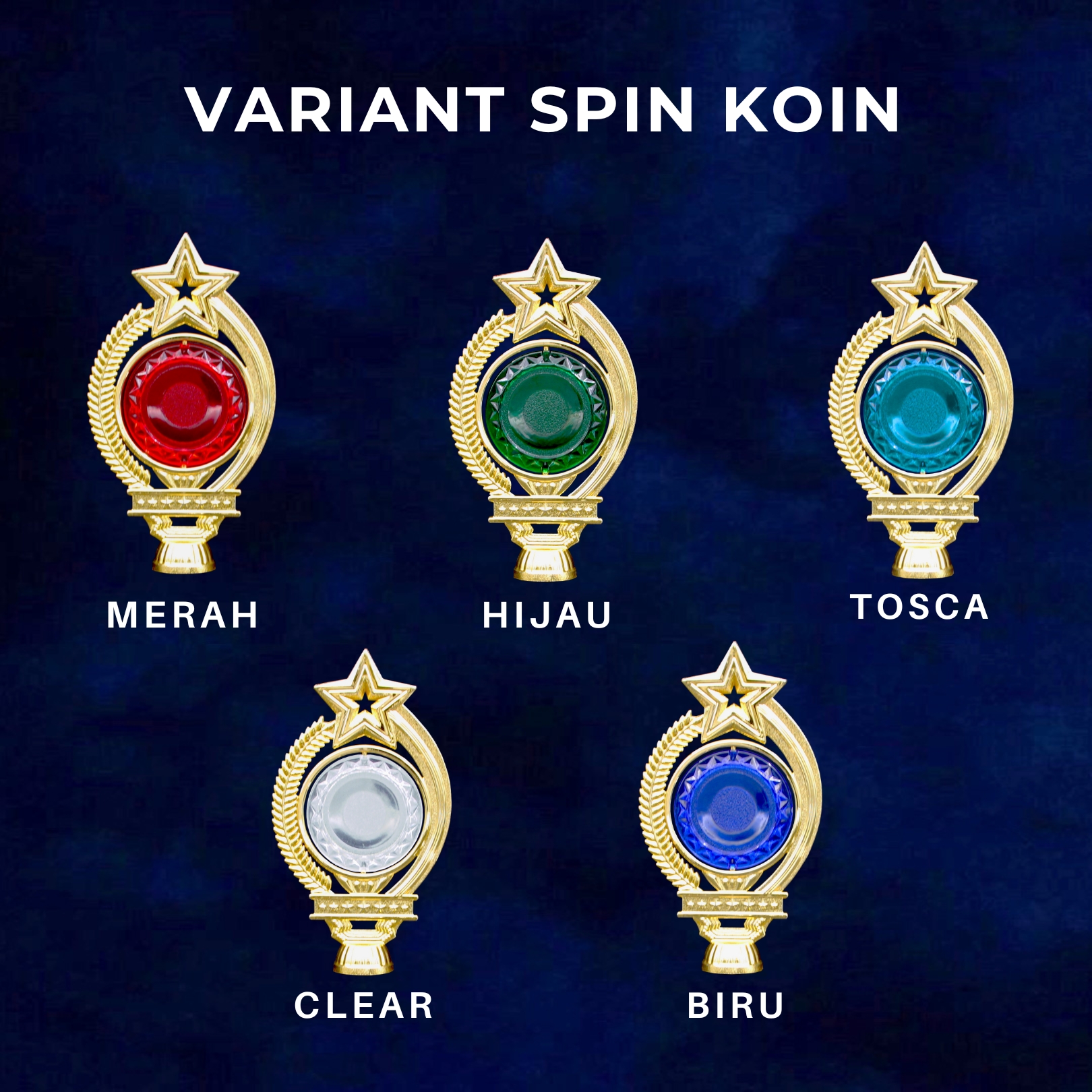 FIGUR SPIN KOIN TRANSPARAN Tinggi : 18,5 cm Lebar : 10,4 cm tersedia dalam 3 warna dasar: – gold – silver – transparan 5 warna koin : – merah – hijau – tosca – transparan – biru