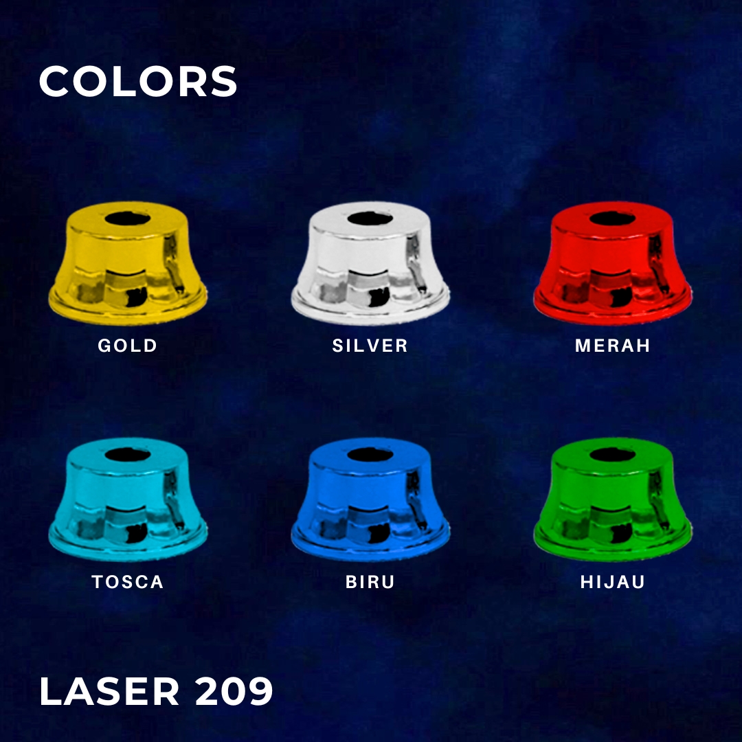 LASER 209 Tinggi : 3 cm Lebar : 3,5 cm menawarkan 6 varian warna : – gold – silver – merah – tosca – biru – hijau